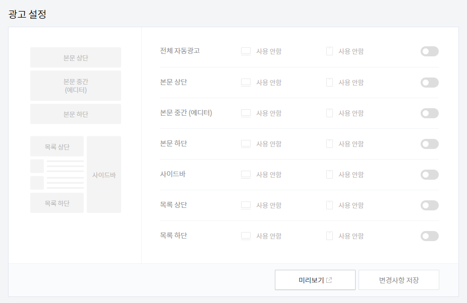 이제 승인도 받았으니 그럼 광고를 적용해볼까?? 룰루 하고 첨에 티스토리 관리자 탭에 들어갔는데, 오잉, 애드핀과는 달리 광고설정 기능이 계속 비활성화 중이다.