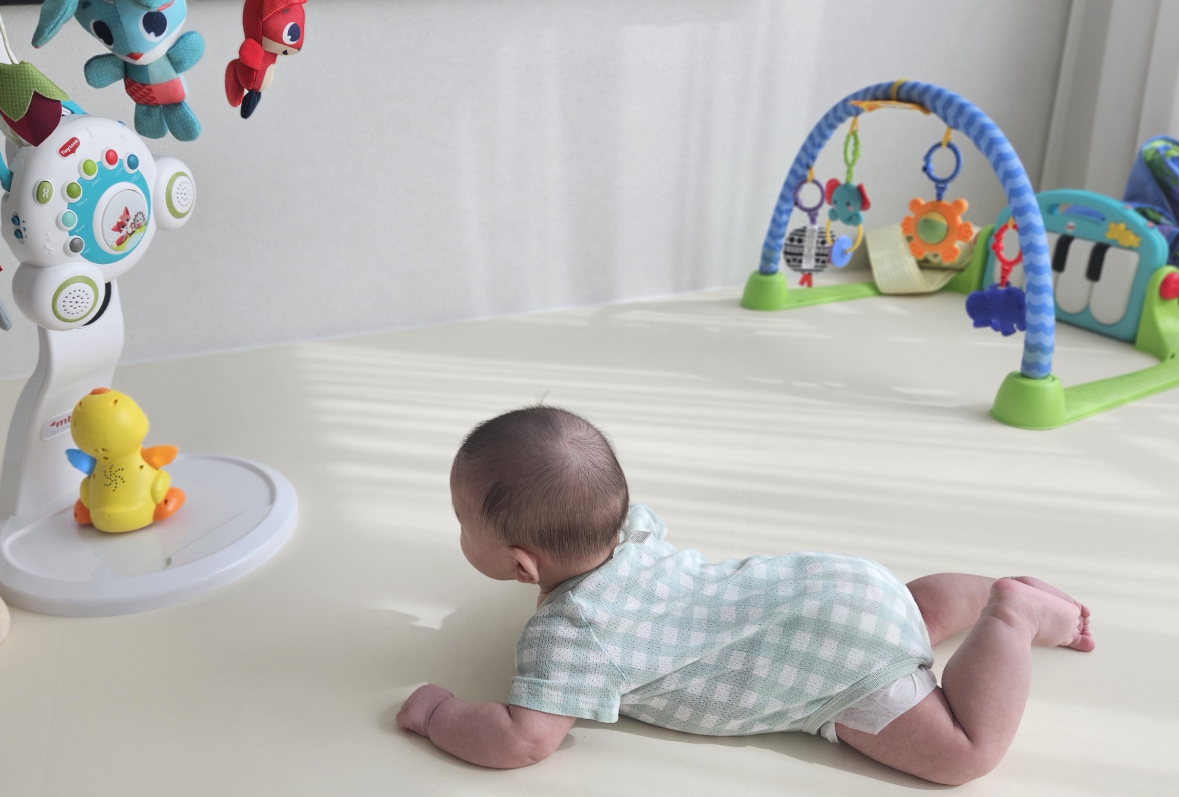- 또 아기와 할수 있는 일이 많아졌다. 누워서 모빌도 보고, 동화책을 펼쳐서 읽어주면 초점책마냥 보고, 가끔 내가 춤을 추는 걸 구경하기도 한다. 아기체육관에서 쿵쾅거리고, 거울 앞에 앉아 스트레칭도 시켜주고, 터미타임도 했다가 다리도 주물러주고. 가끔은 컴퓨터 의자에 앉아서 공부방을 빙그르 구경한다.