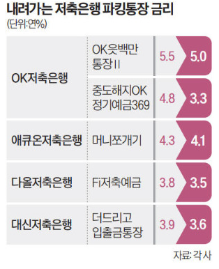 "이럴 줄 알았으면 가입 안했다"…'파킹통장' 불만 폭발한 이유, 치솟았던 파킹통장 금리 한달도 안돼 '뚝' 지난달 연 5%까지 올랐지만 시중금리 하락에 일제히 인하 OK저축銀 단번에 1.5%P 낮춰 소