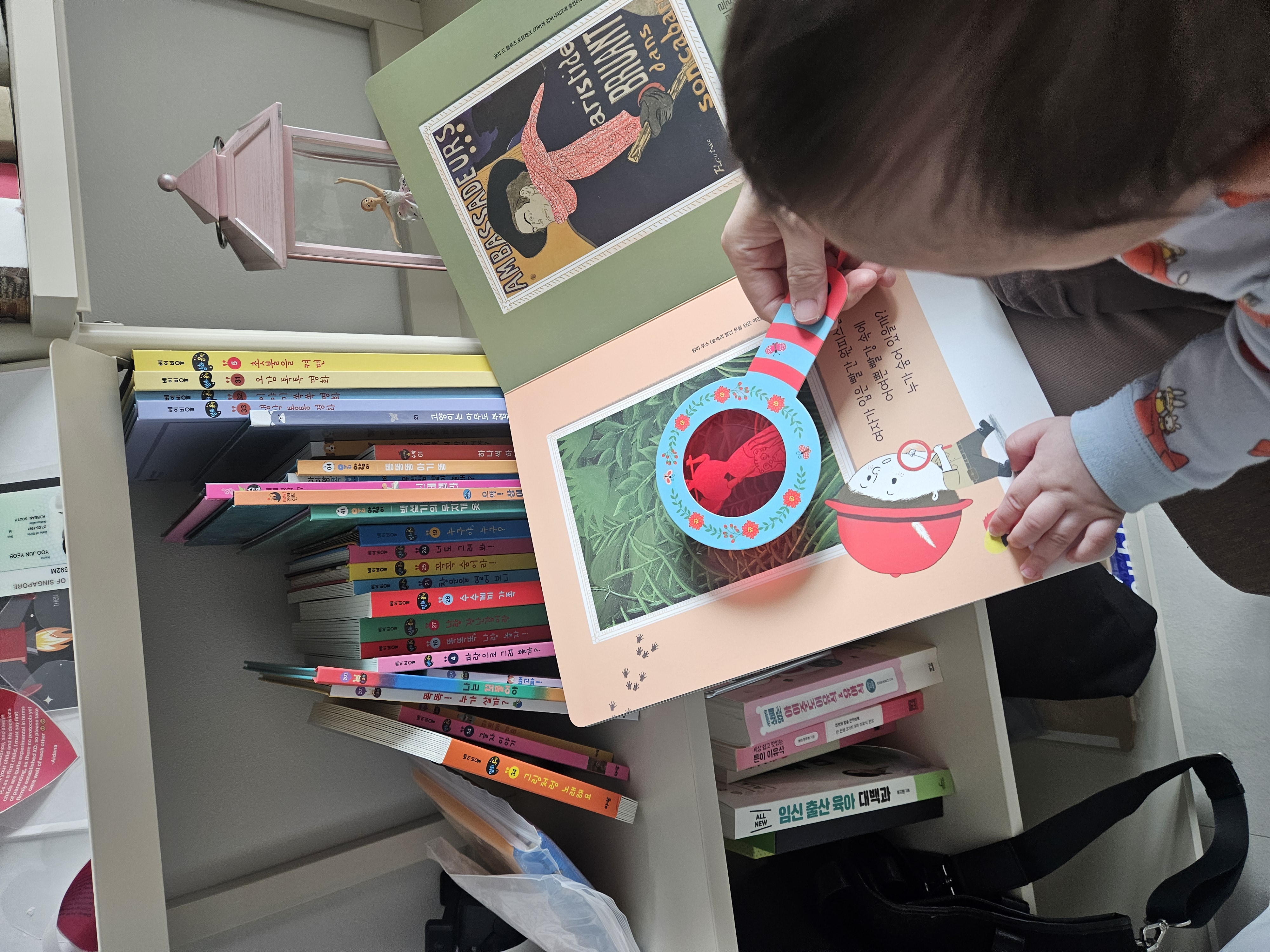 아직까지는 빨강, 파랑, 노랑색을 알려준다 이런 개념은 없이 아이가 좋아할만한 요소가 있는 책을 위주로 노출하고 있다. 이것 저것 시도해보며 아이의 흥미를 어떻게 끌어볼까 고민하는 요즘, 빨강책으로는 돋보기를 흔들어 움직이면서, 노란책은 노래에 맞춰 책을 조작하며 보여주는 중이다. 파란책은... 다음에.. 좀더 크면 조금씩 시도해봐야지. 그때는 돋보기도 조작책도 손에 쥐여주고 본인이 움직여보게 할 수도 있겠다. 아이가 성장함에 따라 책을 보여는 방식을 다르게 변형해가는 재미가 있다.