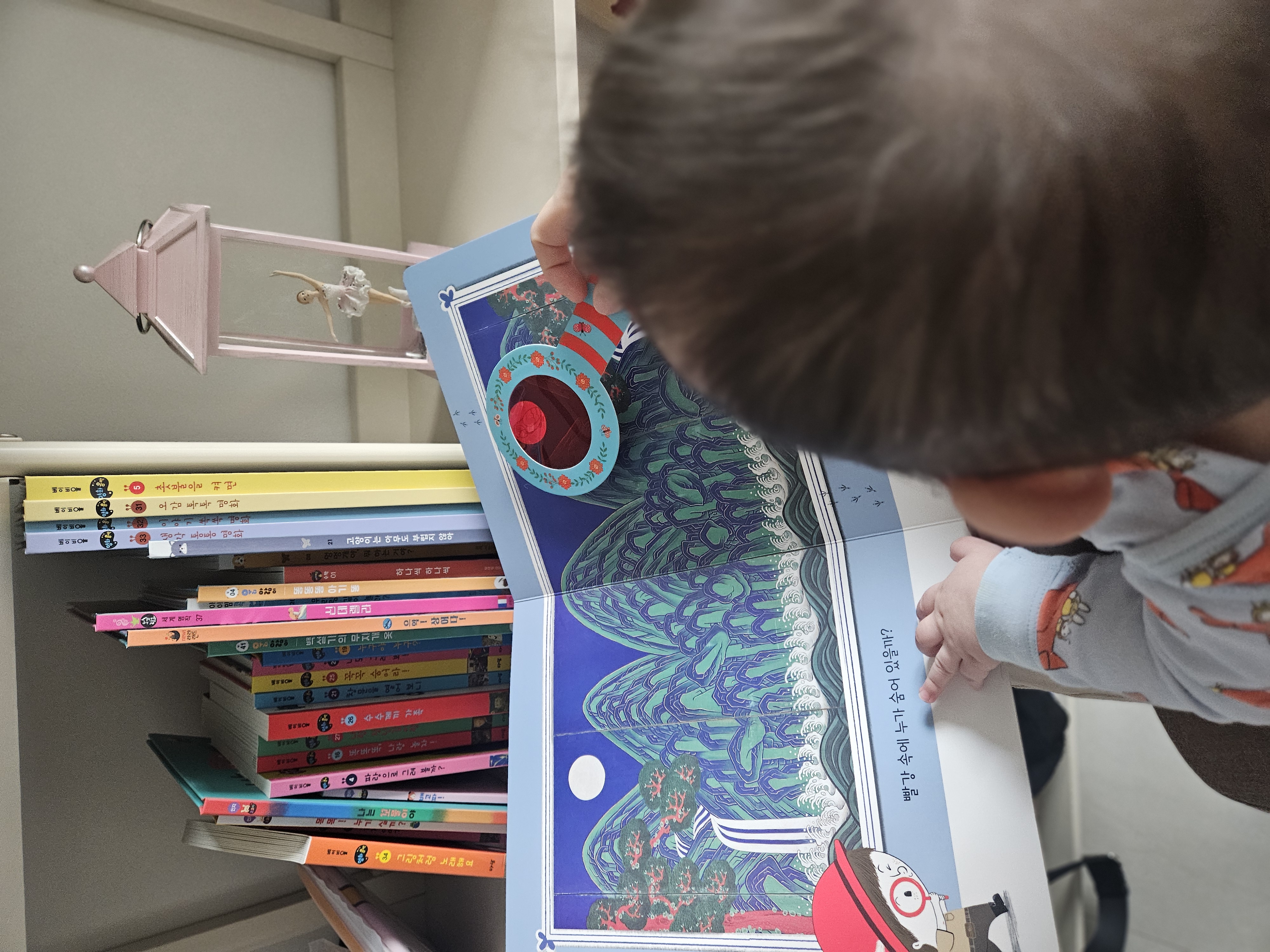 사실 이 책은 아기에게 좀 어려울 것 같아서 빼뒀던 책이다. 그러다 한번 심심해서 아기에게 보여줬는데, 생각보다 집중해서 신기했다. 아직까지는 빨간 돋보기를 비추지 무언가 무늬가 나타나더라...를 인식한 건 아니고, 그냥 돋보기를 잡고 빨고 싶어하는게 아닐까 싶다 ㅋㅋ